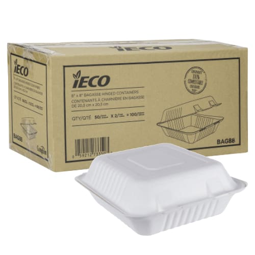 $5 iECO hinged bagasse containers 20.32 cm × 20.32 cm (8 in × 8 in)