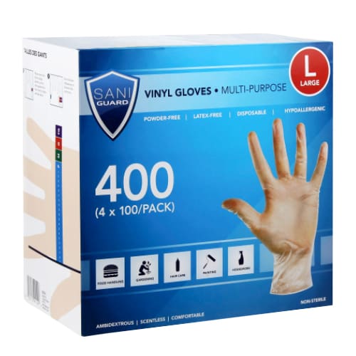 $4.50 Sani Guard vinyl gloves sizes S to XL